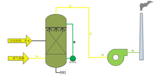 在車間將無組織排放的廢氣首先經(jīng)過收集罩收集后,廢氣經(jīng)過引風(fēng)機(jī)作用下,引入含酸(堿)的洗滌塔吸收中和,使含酸(堿)廢氣中和后達(dá)標(biāo)排放。