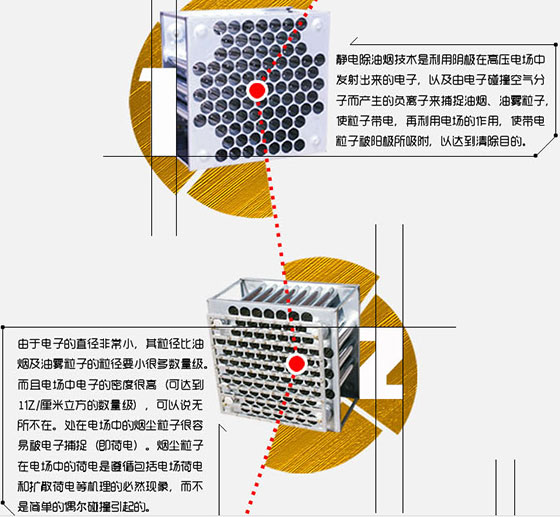 ?? 1、?油煙凈化器的電場使用圓筒蜂窩式結構,使靜電場能均勻地達到很大的平均電場強度,極大的增加了電場凈化面積,使電場與油煙粒子結合作用的時間更長,從而決定了設備具有極高的除油煙效率。?