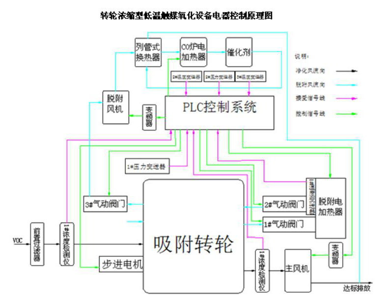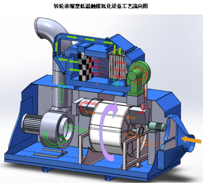 轉輪濃縮型低溫觸媒氧化設備:是采用轉輪式吸附床對有機廢氣進行吸附濃縮,濃縮的有機廢氣在脫附再生區被脫附后,被再生風機引入催化燃燒凈化裝置,進一步凈化處理。整個裝置分為VOC濃縮區和濃縮后VOC凈化處理區兩大模塊。